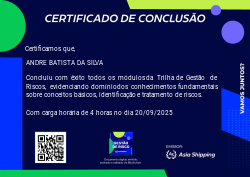 Esta badge certifica a conclusão da Trilha de Gestão de Riscos. O participante demonstrou domínio dos conhecimentos essenciais sobre a conceitos básicos, identificação e tratamento de riscos.