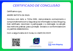 Esta badge é concedida aos colaboradores que completaram com sucesso a trilha de cursos sobre Segurança da Informação, demonstrando conhecimento e compromisso com as melhores práticas de proteção de dados e a conformidade com a política de segurança da Asia Shipping.