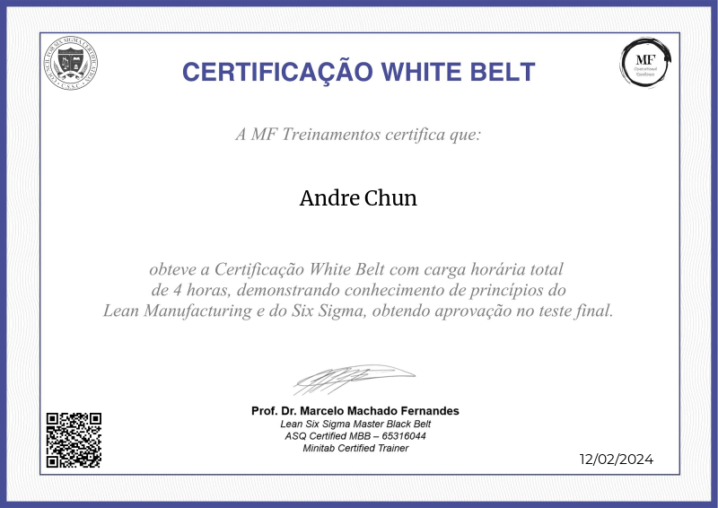 Desbloqueando os princípios fundamentais do Lean Six Sigma, a certificação White Belt oferecida pela MF OPEX, liderada pelo Professor Marcelo Fernandes, destaca-se como um farol de excelência em treinamento operacional. Através de um currículo abrangente que combina teoria com aplicação prática, os participantes adquirem insights inestimáveis sobre redução de desperdícios, gestão de variação e melhoria contínua. A expertise do Professor Fernandes infunde o programa com práticas líderes do setor, equipando os aprendizes com o conhecimento e as habilidades necessárias para impulsionar melhorias tangíveis dentro de suas organizações. Servindo como catalisador para o crescimento profissional, esta certificação abre caminho para avanços adicionais no campo da excelência operacional, capacitando os indivíduos a se tornarem agentes de mudança positiva em suas respectivas indústrias.
