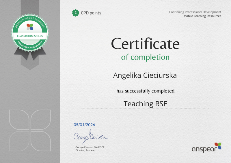 Awarded for completing the Teaching RSE CPD course from Anspear.
