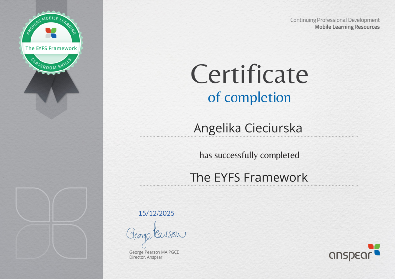 Awarded for completing the The EYFS Framework CPD course from Anspear.