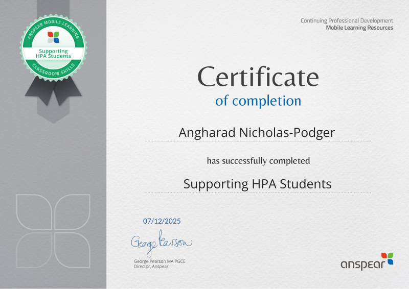 Awarded for completing the Supporting HPA Students CPD course from Anspear.