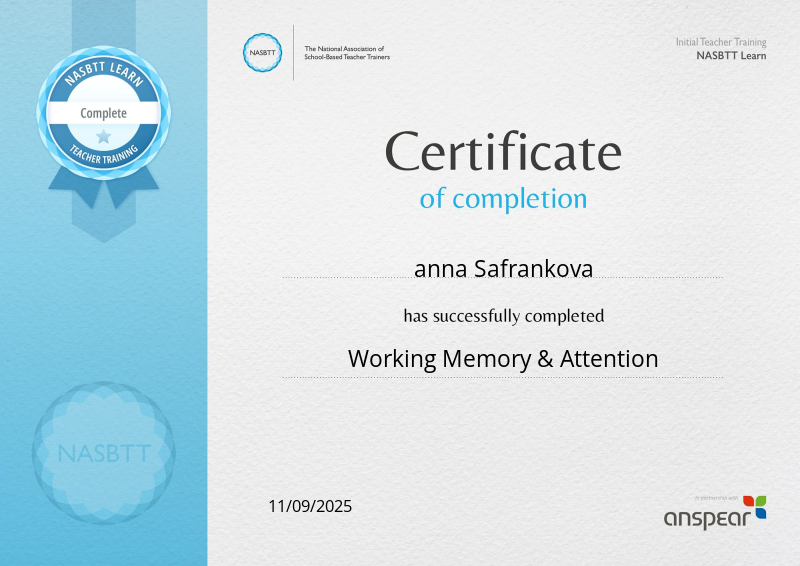 Completed the NASBTT Learn module Working Memory & Attention. 1 hour of self-directed learning.