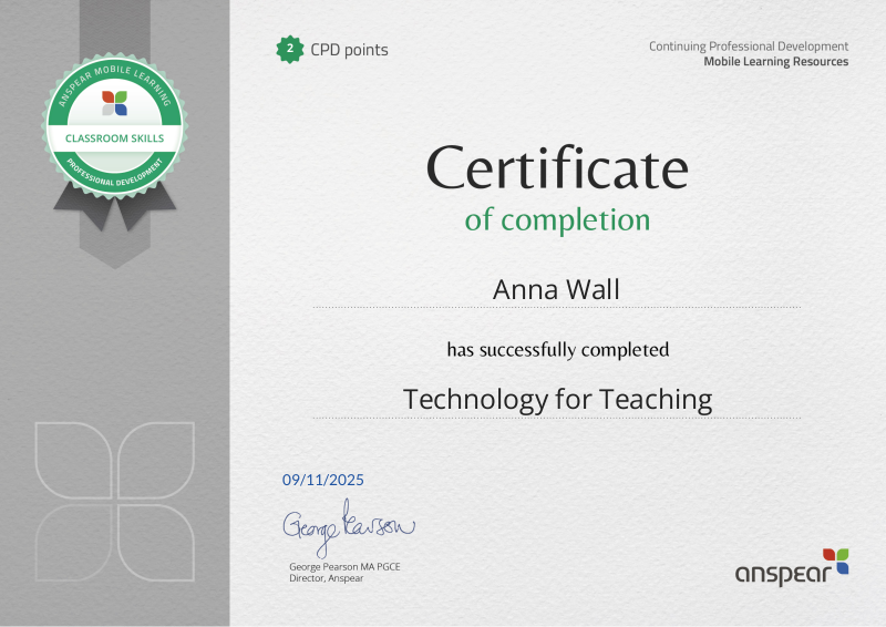 Awarded for completing the Technology for Teaching CPD course from Anspear.