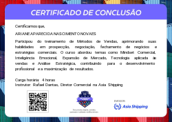 Este Badge Digital reconhece a participação no treinamento em Métodos de Vendas, ministrado por Rafael Dantas, Diretor Comercial na Asia Shipping, abrangendo estratégias avançadas de prospecção, negociação e fechamento. O profissional desenvolveu habilidades em Mindset Comercial, Inteligência Emocional, Expansão de Mercado, Tecnologia aplicada às vendas e Análise Estratégica, aprimorando sua capacidade de gerar valor e maximizar resultados comerciais.