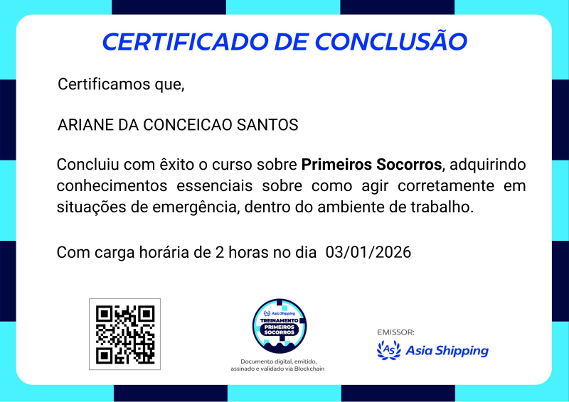 Esta badge digital certifica a conclusão do Treinamento de Primeiros Socorros da Asia Shipping, demonstrando um compromisso proativo com a segurança e a saúde de todos no ambiente de trabalho.