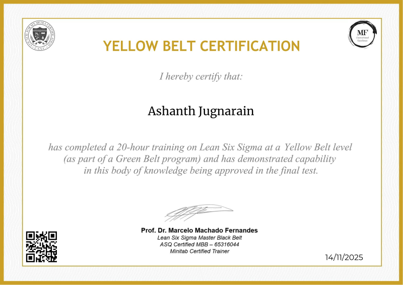 Delving into the intermediate principles of Lean Six Sigma, the Yellow Belt certification provided by MF OPEX, guided by Professor Marcelo Fernandes, marks a significant progression in operational excellence training. Through a meticulously structured curriculum blending advanced theories with practical application, participants deepen their understanding of process optimization, advanced data analysis, and project leadership. Professor Fernandes' renowned expertise enriches the program with cutting-edge methodologies, empowering learners to spearhead impactful improvements within their organizations. Serving as a pivotal milestone in professional development, this certification not only opens doors to larger-scale projects but also fosters the confidence and skills needed to drive transformative change across diverse industry landscapes.