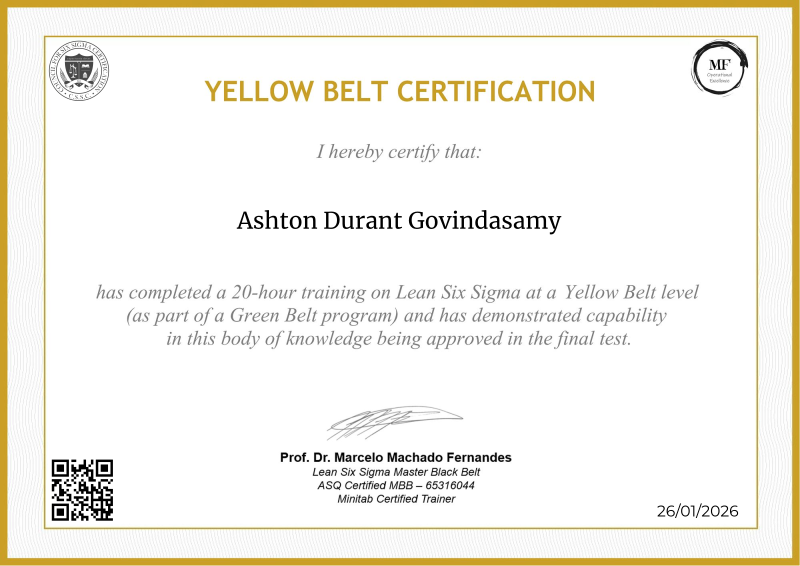 Delving into the intermediate principles of Lean Six Sigma, the Yellow Belt certification provided by MF OPEX, guided by Professor Marcelo Fernandes, marks a significant progression in operational excellence training. Through a meticulously structured curriculum blending advanced theories with practical application, participants deepen their understanding of process optimization, advanced data analysis, and project leadership. Professor Fernandes' renowned expertise enriches the program with cutting-edge methodologies, empowering learners to spearhead impactful improvements within their organizations. Serving as a pivotal milestone in professional development, this certification not only opens doors to larger-scale projects but also fosters the confidence and skills needed to drive transformative change across diverse industry landscapes.