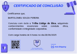 Este badge certifica a conclusão da Trilha Código de Ética. Atesta conhecimento em conduta íntegra, conformidade legal (LGPD, SGSI), anticorrupção e processos de investigação interna, essenciais para a organização.