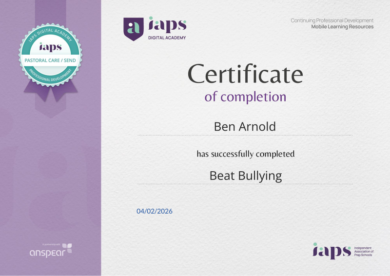Awarded for completing the Beat Bullying CPD course from the IAPS Digital Academy.