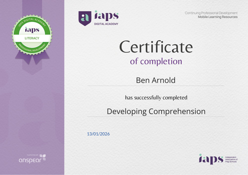 Awarded for completing the Developing Comprehension CPD course from the IAPS Digital Academy.