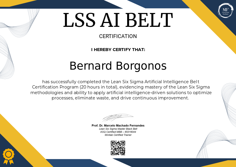 The Lean Six Sigma Artificial Intelligence Belt is a specialized certification that integrates the core principles of Lean Six Sigma with the cutting-edge capabilities of artificial intelligence. This certification equips professionals with the tools to analyze data, optimize processes, and eliminate waste more effectively through AI-driven insights. By blending statistical methodologies with machine learning and automation, individuals holding this certification can drive continuous improvement, enhance operational efficiency, and deliver measurable results in complex environments, leveraging technology to solve problems faster and with greater precision.