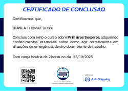 Esta badge digital certifica a conclusão do Treinamento de Primeiros Socorros da Asia Shipping, demonstrando um compromisso proativo com a segurança e a saúde de todos no ambiente de trabalho.