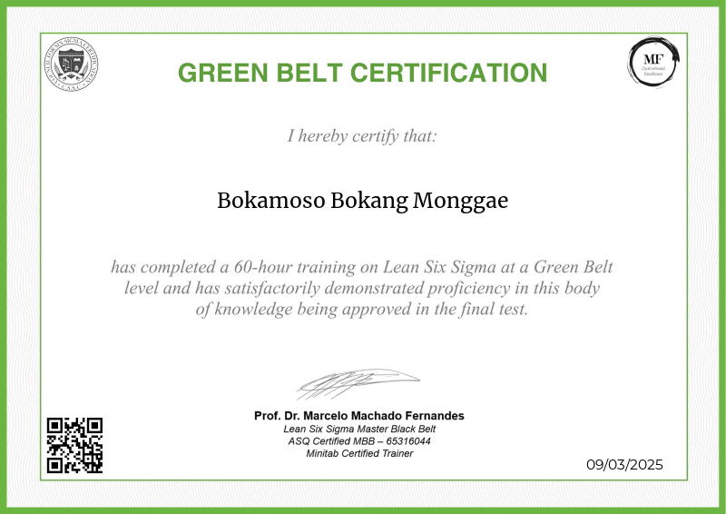 Exploring the principles of Lean Six Sigma, the Green Belt certification offered by MF OPEX, under the mentorship of Professor Marcelo Fernandes, represents a pivotal step forward in operational excellence training. Equipped with an extensive curriculum blending advanced theories with hands-on application, participants not only deepen their understanding of process optimization, advanced data analysis, and project leadership but also become adept at spearheading Lean Six Sigma projects. Professor Fernandes' esteemed guidance enriches the program with cutting-edge methodologies, empowering learners to drive substantial improvements within their organizations. Serving as a significant milestone in professional development, this certification not only qualifies individuals to lead larger-scale projects but also instills the confidence and expertise needed to enact transformative change across diverse industry landscapes.