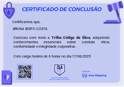 Este badge certifica a conclusão da Trilha Código de Ética. Atesta conhecimento em conduta íntegra, conformidade legal (LGPD, SGSI), anticorrupção e processos de investigação interna, essenciais para a organização.