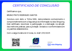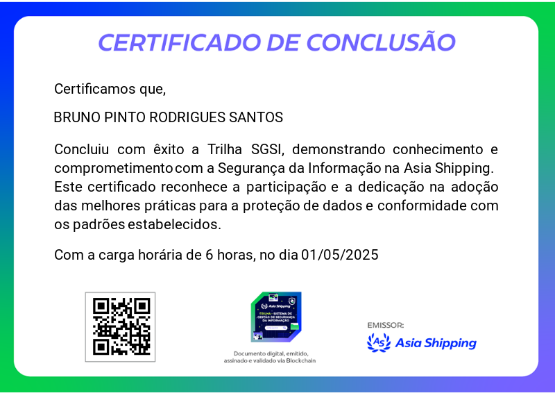 Esta badge é concedida aos colaboradores que completaram com sucesso a trilha de cursos sobre Segurança da Informação, demonstrando conhecimento e compromisso com as melhores práticas de proteção de dados e a conformidade com a política de segurança da Asia Shipping.