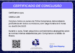 A Trilha Compliance é mais uma Badge do programa de certificação da Asia Shipping. Com ela você terá a oportunidade de conhecer mas sobre Compliance na Asia Shipping, como também Gestão de Riscos, suas principais definições e etapas de identificação.