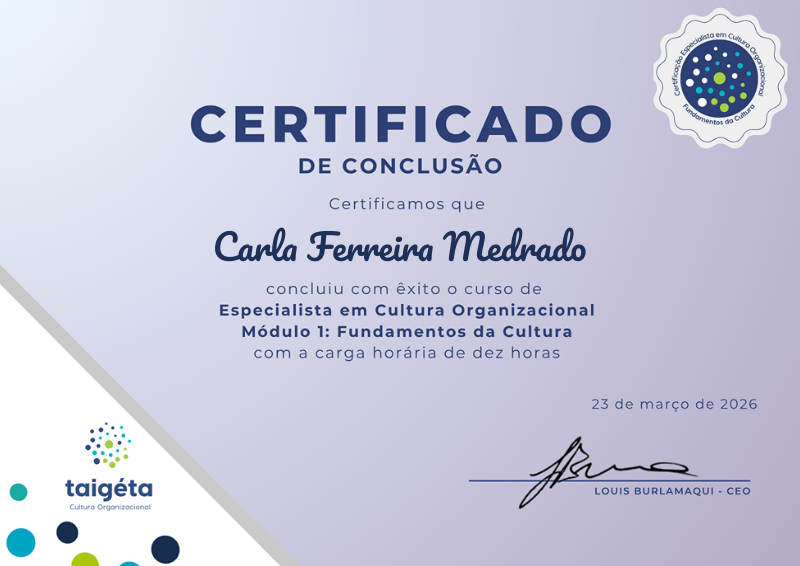 Para ganhar esta medalha e certificado, o aluno concluiu a carga horária do módulo 1 Fundamentos da Cultura Organizacional e entregou seu trabalho de conclusão de módulo com nota satisfatória.
