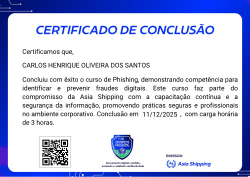 O badge de treinamento em Phishing faz parte do programa de certificação da Asia Shipping e capacita os participantes a reconhecer e evitar tentativas de fraude digital. Com foco em práticas seguras de comunicação e proteção de dados no ambiente corporativo, o treinamento prepara os colaboradores para identificar ameaças e fortalecer a segurança da informação na empresa.