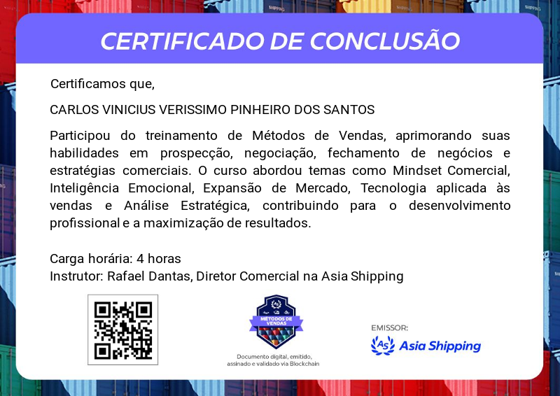 Este Badge Digital reconhece a participação no treinamento em Métodos de Vendas, ministrado por Rafael Dantas, Diretor Comercial na Asia Shipping, abrangendo estratégias avançadas de prospecção, negociação e fechamento. O profissional desenvolveu habilidades em Mindset Comercial, Inteligência Emocional, Expansão de Mercado, Tecnologia aplicada às vendas e Análise Estratégica, aprimorando sua capacidade de gerar valor e maximizar resultados comerciais.