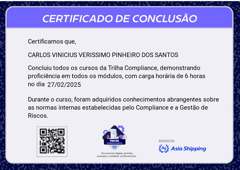 A Trilha Compliance é mais uma Badge do programa de certificação da Asia Shipping. Com ela você terá a oportunidade de conhecer mas sobre Compliance na Asia Shipping, como também Gestão de Riscos, suas principais definições e etapas de identificação.