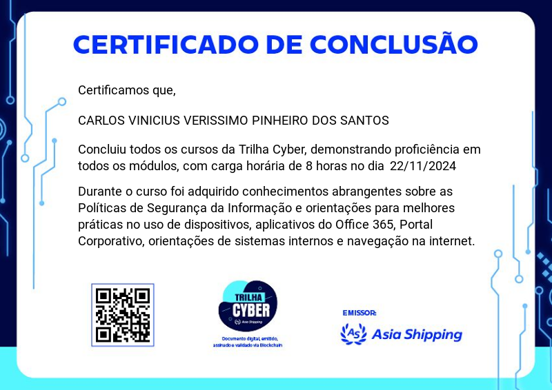 A Trilha Cyber é um dos badges do programa de certificação da Asia Shipping. Ela aborda as melhores práticas de uso dos sistemas internos e do e-mail corporativo, reforçando a segurança e a eficiência no ambiente digital.