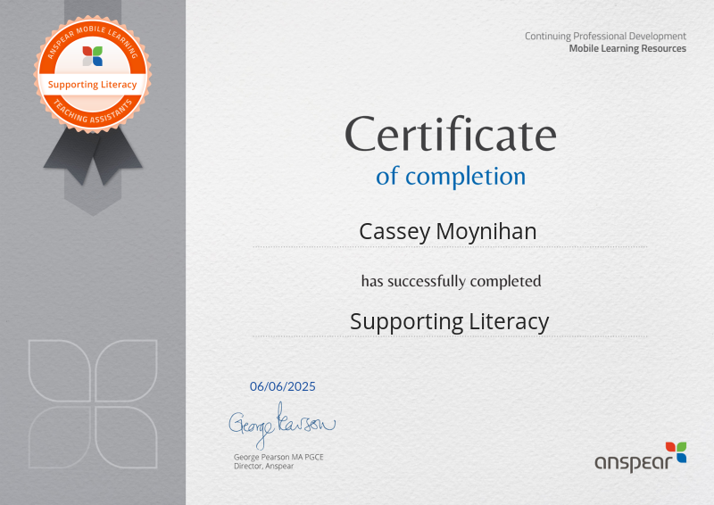 Awarded for completing the Supporting Literacy: TAs CPD course from Anspear.