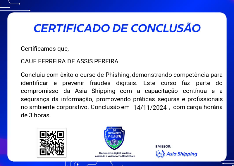 O badge de treinamento em Phishing faz parte do programa de certificação da Asia Shipping e capacita os participantes a reconhecer e evitar tentativas de fraude digital. Com foco em práticas seguras de comunicação e proteção de dados no ambiente corporativo, o treinamento prepara os colaboradores para identificar ameaças e fortalecer a segurança da informação na empresa.