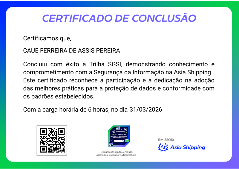 Esta badge é concedida aos colaboradores que completaram com sucesso a trilha de cursos sobre Segurança da Informação, demonstrando conhecimento e compromisso com as melhores práticas de proteção de dados e a conformidade com a política de segurança da Asia Shipping.