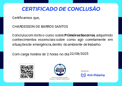 Esta badge digital certifica a conclusão do Treinamento de Primeiros Socorros da Asia Shipping, demonstrando um compromisso proativo com a segurança e a saúde de todos no ambiente de trabalho.