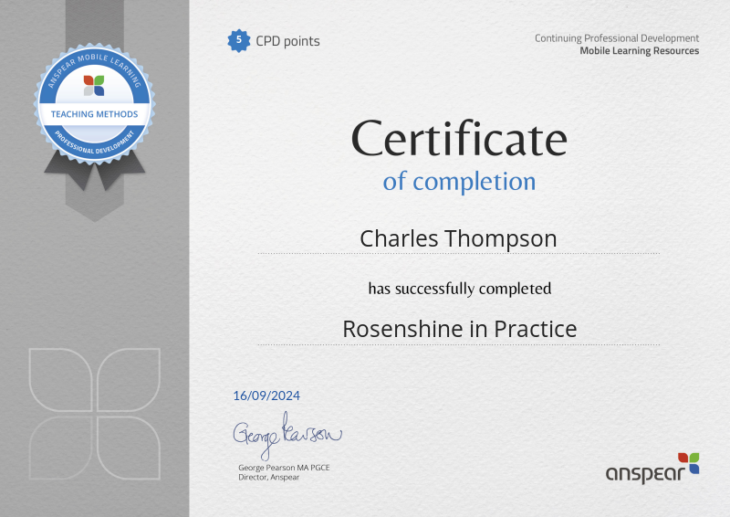 Awarded for completing the Rosenshine in Practice CPD course from Anspear.