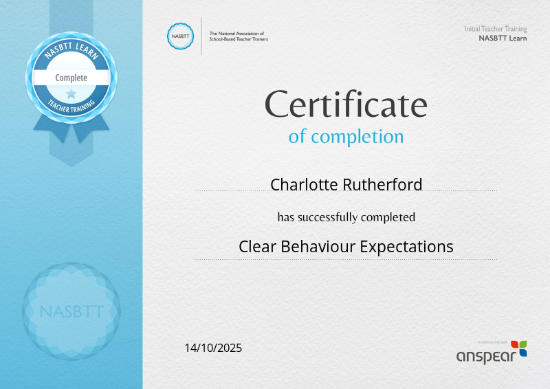 Completed the NASBTT Learn module Clear Behaviour Expectations. 1 hour of self-directed learning.
