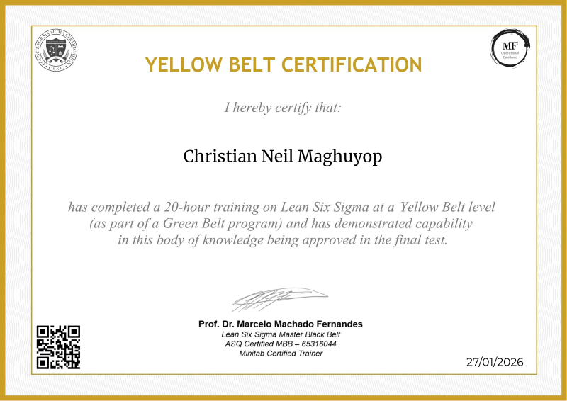 Delving into the intermediate principles of Lean Six Sigma, the Yellow Belt certification provided by MF OPEX, guided by Professor Marcelo Fernandes, marks a significant progression in operational excellence training. Through a meticulously structured curriculum blending advanced theories with practical application, participants deepen their understanding of process optimization, advanced data analysis, and project leadership. Professor Fernandes' renowned expertise enriches the program with cutting-edge methodologies, empowering learners to spearhead impactful improvements within their organizations. Serving as a pivotal milestone in professional development, this certification not only opens doors to larger-scale projects but also fosters the confidence and skills needed to drive transformative change across diverse industry landscapes.