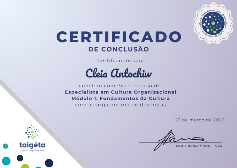 Para ganhar esta medalha e certificado, o aluno concluiu a carga horária do módulo 1 Fundamentos da Cultura Organizacional e entregou seu trabalho de conclusão de módulo com nota satisfatória.
