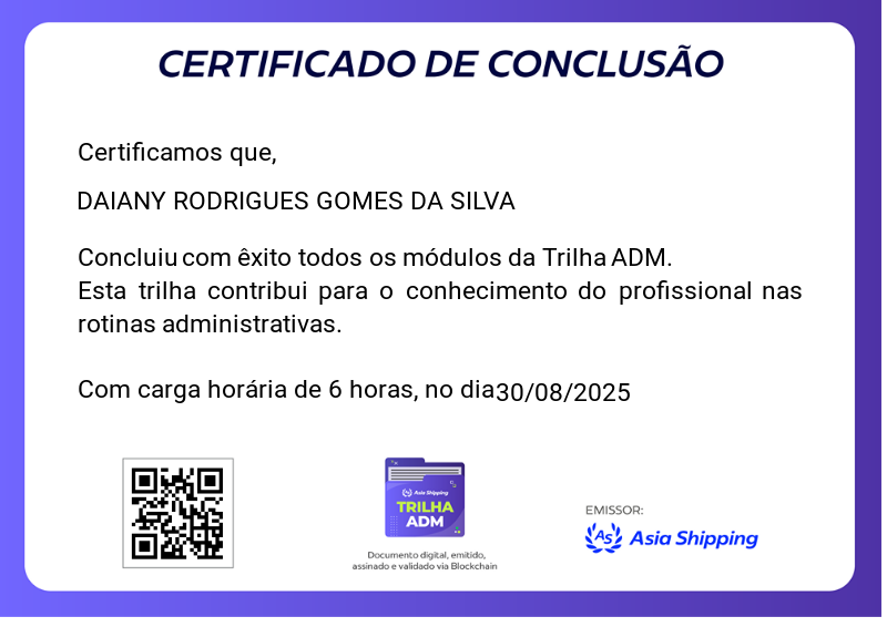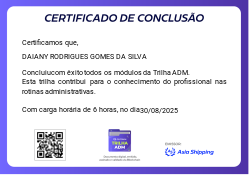 Esta badge é concedida aos colaboradores que completaram com sucesso a Trilha ADM, que teve como objetivo preparar o colaborador para atuar com excelência em rotinas administrativas essenciais.