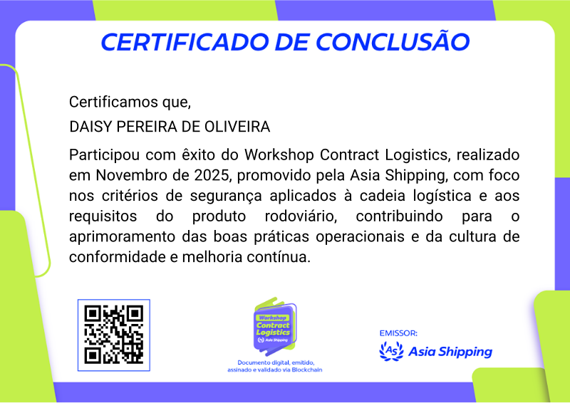 Para receber a Badge do Workshop Contract Logistics, é necessário ter participado do evento realizado em 2025, promovido pela Asia Shipping.
