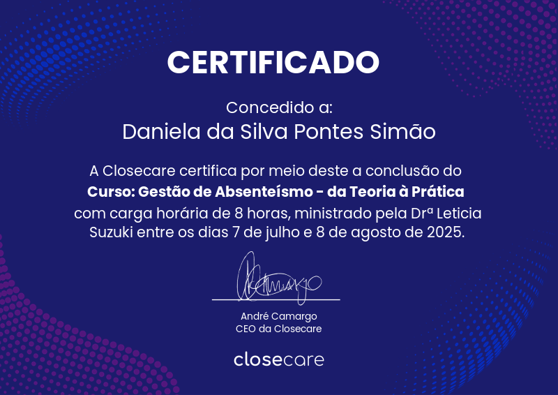 O curso de Gestão de Absenteísmo: da Teoria à Prática aconteceu entre os dias 7 de julho e 8 de agosto. As aulas foram ministradas pela Drª Leticia Suzuki (https://www.linkedin.com/in/leticia-cristina-suzuki-621585131/). O curso foi composto por seis aulas que abordaram os seguintes tópicos: