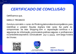O badge de treinamento em Phishing faz parte do programa de certificação da Asia Shipping e capacita os participantes a reconhecer e evitar tentativas de fraude digital. Com foco em práticas seguras de comunicação e proteção de dados no ambiente corporativo, o treinamento prepara os colaboradores para identificar ameaças e fortalecer a segurança da informação na empresa.