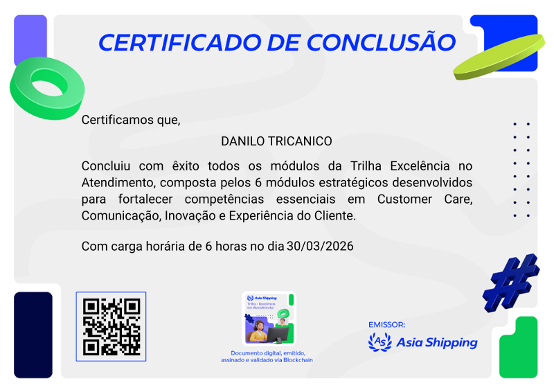 Esta badge certifica a conclusão da Trilha Excelência em Atendimento. O participante desenvolveu habilidades fundamentais para atuar com empatia, proatividade, visão consultiva e excelência no relacionamento com clientes internos e externos.