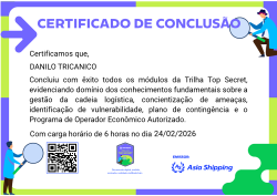 Esta badge certifica a conclusão da Trilha Top Secret. O participante demonstrou domínio sobre conceitos de Gestão da Cadeia Logística, conscientização de ameaças, identificação de vulnerabilidades, plano de Contingência e Programa de Operador Econômico Autorizado.