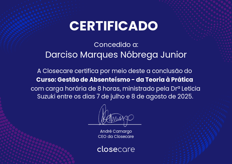 O curso de Gestão de Absenteísmo: da Teoria à Prática aconteceu entre os dias 7 de julho e 8 de agosto. As aulas foram ministradas pela Drª Leticia Suzuki (https://www.linkedin.com/in/leticia-cristina-suzuki-621585131/). O curso foi composto por seis aulas que abordaram os seguintes tópicos:
