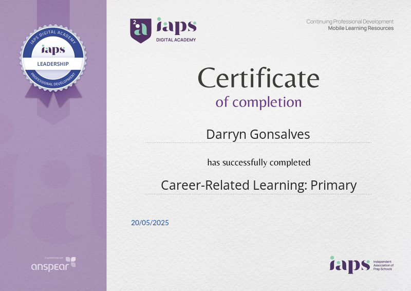 Awarded for completing the Career-Related Learning CPD course from the IAPS Digital Academy.