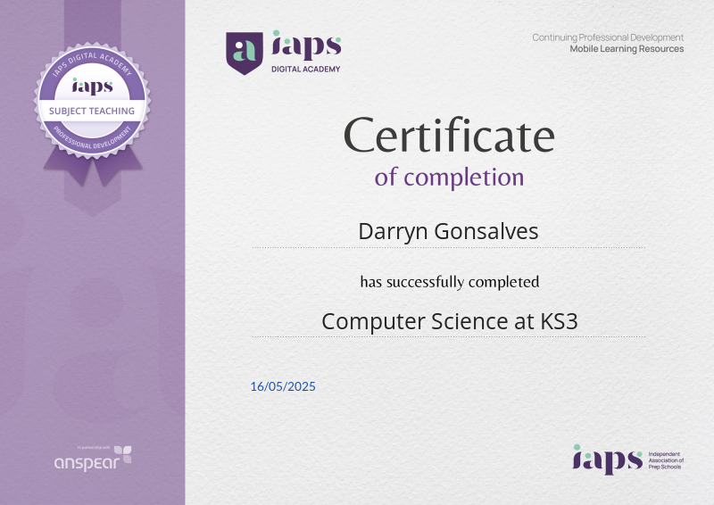 Awarded for completing the Computer Science at KS3 CPD course from the IAPS Digital Academy.
