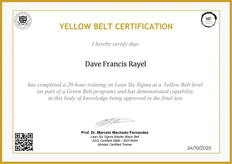 Delving into the intermediate principles of Lean Six Sigma, the Yellow Belt certification provided by MF OPEX, guided by Professor Marcelo Fernandes, marks a significant progression in operational excellence training. Through a meticulously structured curriculum blending advanced theories with practical application, participants deepen their understanding of process optimization, advanced data analysis, and project leadership. Professor Fernandes' renowned expertise enriches the program with cutting-edge methodologies, empowering learners to spearhead impactful improvements within their organizations. Serving as a pivotal milestone in professional development, this certification not only opens doors to larger-scale projects but also fosters the confidence and skills needed to drive transformative change across diverse industry landscapes.