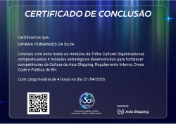 Esta badge digital certifica a conclusão da Trilha Cultura Organizacional na Asia Shipping. O detentor demonstra domínio completo dos conceitos de Cultura Organizacional, Regulamento Interno, Dress Code e Políticas de RH.