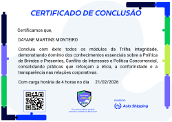 Esta badge certifica a conclusão da trilha de Integridade. O participante demonstrou domínio dos conhecimentos essenciais sobre a Política de Brindes e Presentes, Conflito de Interesses e Política Concorrencial, consolidando práticas que reforçam a ética, a conformidade e a transparência nas relações corporativas. Esses pilares são fundamentais para a integridade, a reputação e o sucesso da organização.