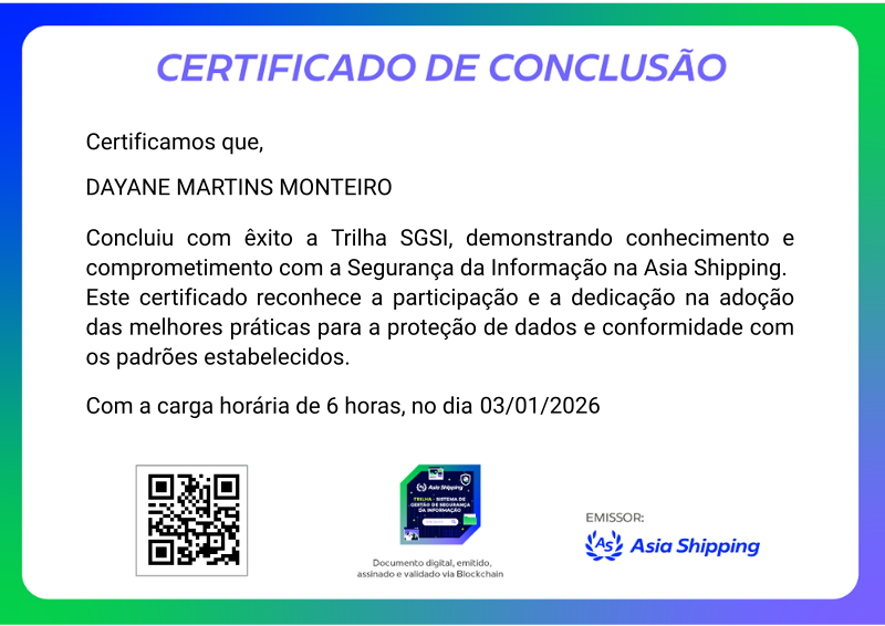 Esta badge é concedida aos colaboradores que completaram com sucesso a trilha de cursos sobre Segurança da Informação, demonstrando conhecimento e compromisso com as melhores práticas de proteção de dados e a conformidade com a política de segurança da Asia Shipping.