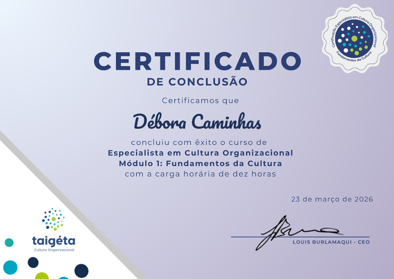 Para ganhar esta medalha e certificado, o aluno concluiu a carga horária do módulo 1 Fundamentos da Cultura Organizacional e entregou seu trabalho de conclusão de módulo com nota satisfatória.