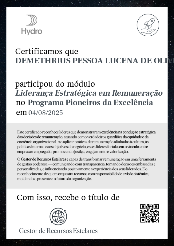 ✅ Participar integralmente do módulo Liderança Estratégica em Remuneração no programa Pioneiros da Excelência, demonstrando presença ativa nas discussões e atividades.