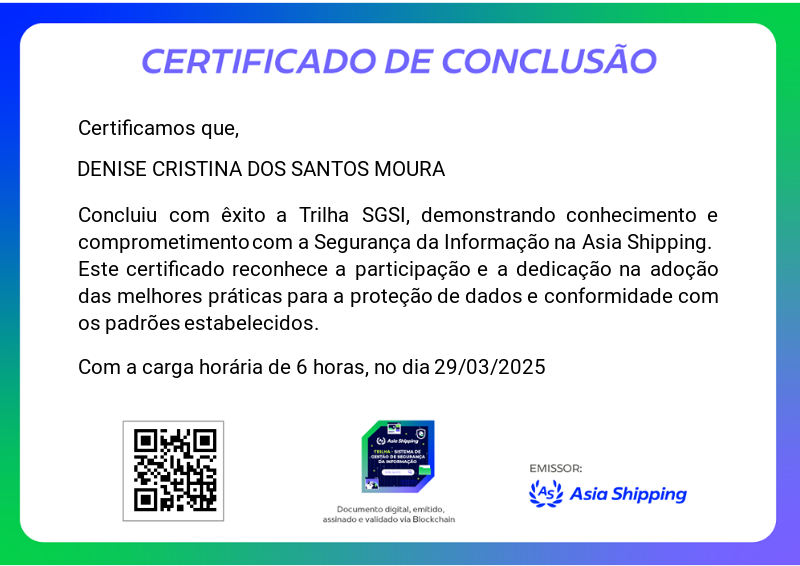 Esta badge é concedida aos colaboradores que completaram com sucesso a trilha de cursos sobre Segurança da Informação, demonstrando conhecimento e compromisso com as melhores práticas de proteção de dados e a conformidade com a política de segurança da Asia Shipping.
